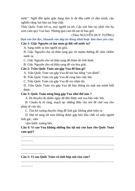 Câu 5. Quốc Toản vô tình bóp nát quả cam vì bị Vua xem là trẻ con và