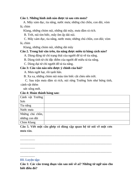 Câu 4: Hoàn thành bảng sau: Cảnh vật Trường Sơn Tia nắng Nước mưa Những chú chồn, những con dũi Chim Klang
