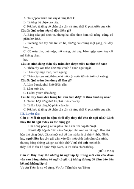 Câu 6: B. Tả lần lượt từng bộ phận của cây. III. Luyện tập: Câu 1: