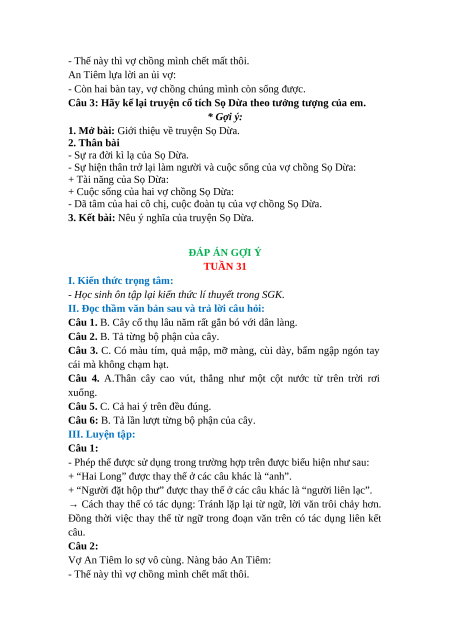 3. Kết bài: Nêu ý nghĩa của truyện Sọ Dừa. ĐÁP ÁN GỢI Ý TUẦN 31