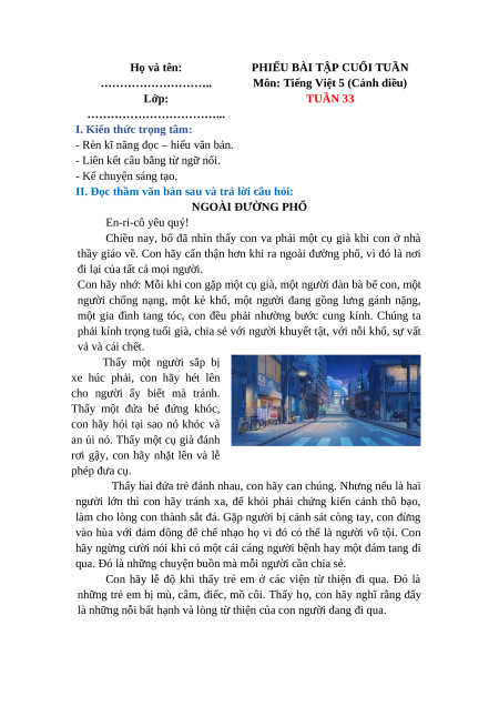 Môn: Tiếng Việt 5 (Cánh diều) Lớp: TUẦN 33