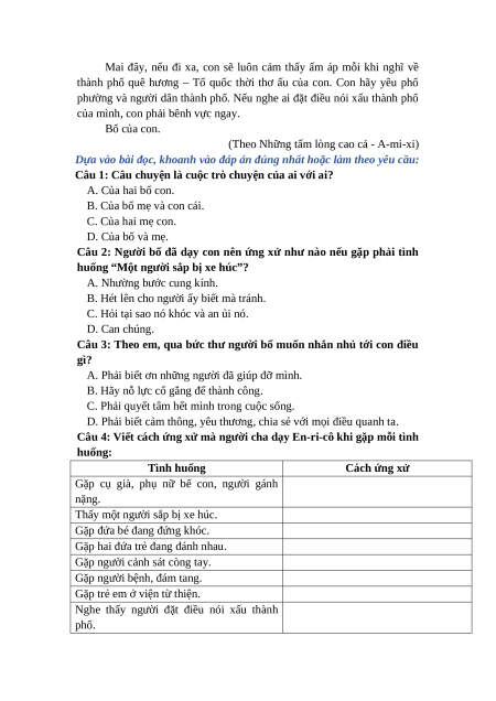 II. Đọc thầm văn bản sau và trả lời câu hỏi: NGOÀI ĐƯỜNG PHỐ En-ri-cô yêu quý!