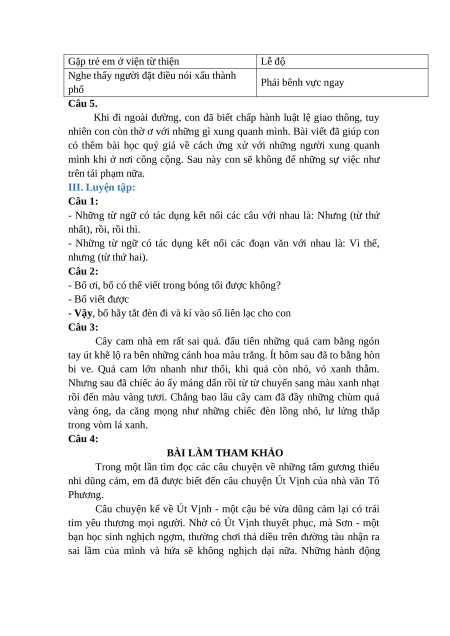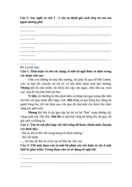 Câu 5: Suy nghĩ và viết 1 - 2 câu tự đánh giá cách ứng xử của em ngoài đường phố.