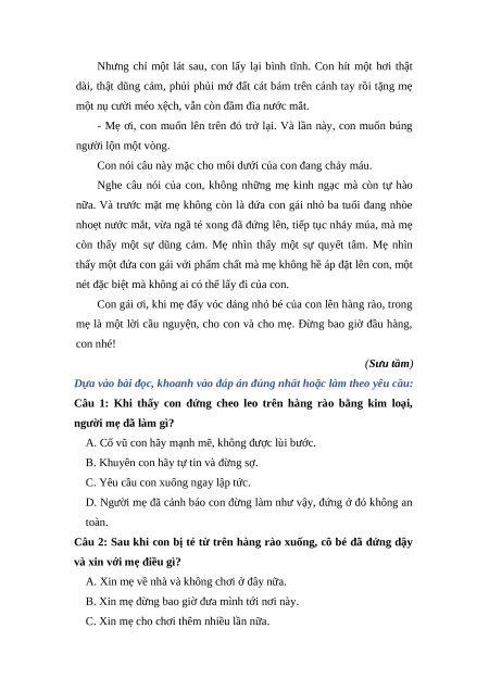 Câu 2: Sau khi con bị té từ trên hàng rào xuống, cô bé đã đứng dậy