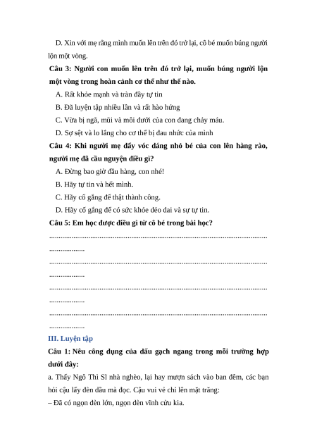 Câu 4: Khi người mẹ đẩy vóc dáng nhỏ bé của con lên hàng rào,