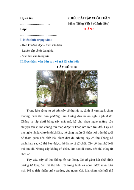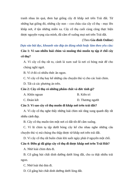 II. Đọc thầm văn bản sau và trả lời câu hỏi: CÂY CỔ THỤ