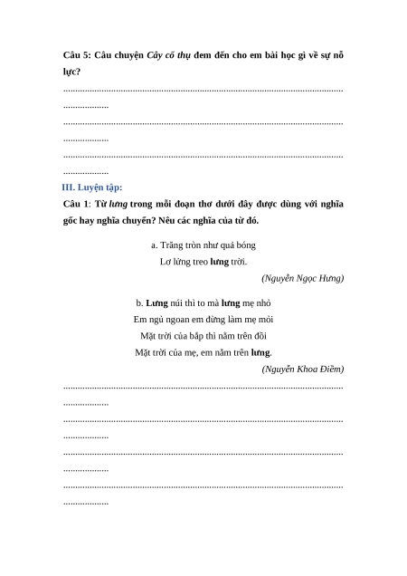 Câu 1: Từ lưng trong mỗi đoạn thơ dưới đây được dùng với nghĩa