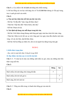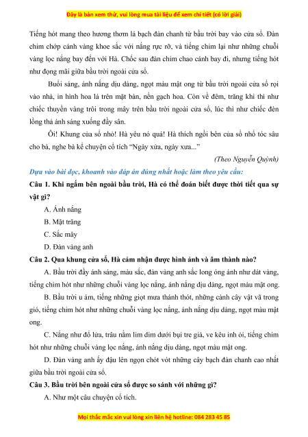Câu 1. Khi ngắm bên ngoài bầu trời, Hà có thể đoán biết được thời tiết qua sự vật gì? A. Ánh nắng B. Mặt trăng C. Sắc mây D. Đàn vàng anh