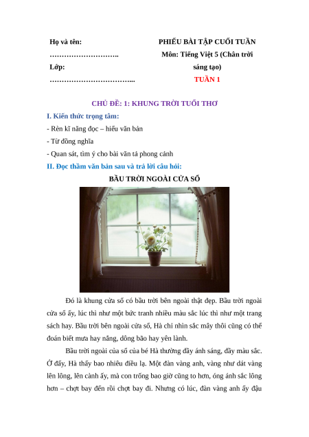 Bài tập cuối tuần Tiếng Việt lớp 5 Chân trời sáng tạo Tuần 1