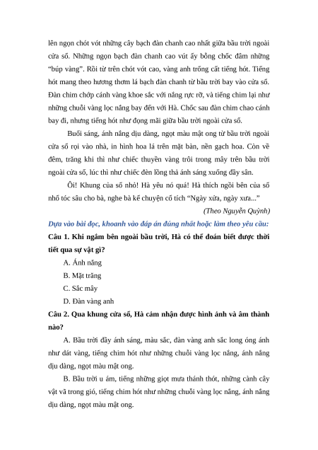 tiết qua sự vật gì? A. Ánh nắng B. Mặt trăng C. Sắc mây D. Đàn vàng anh