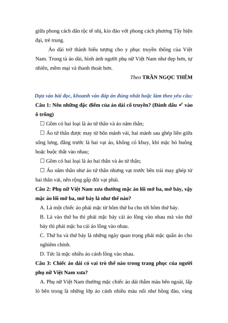 II. Đọc thầm văn bản sau và trả lời câu hỏi: TÀ ÁO DÀI VIỆT NAM