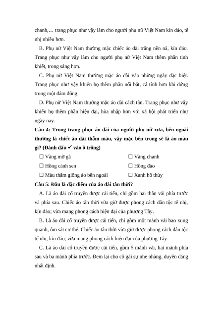Câu 4: Trong trang phục áo dài của người phụ nữ xưa, bên ngoài