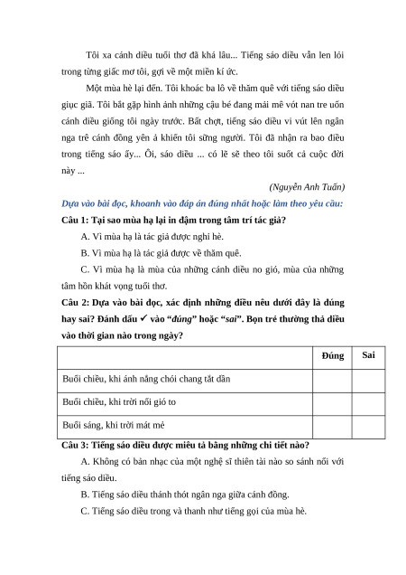 II. Đọc thầm văn bản sau và trả lời câu hỏi: TIẾNG SÁO DIỀU