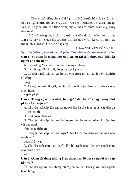 II. Đọc thầm văn bản sau và trả lời câu hỏi: PHÂN XỬ TÀI TÌNH