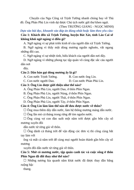 II. Đọc thầm văn bản sau và trả lời câu hỏi: