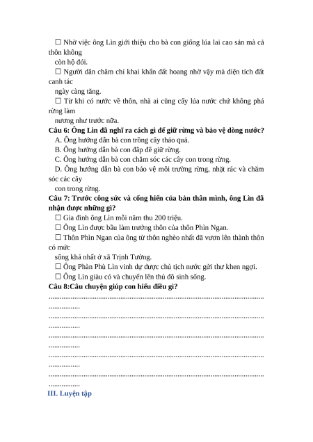 Câu 6: Ông Lìn đã nghĩ ra cách gì để giữ rừng và bảo vệ dòng nước?