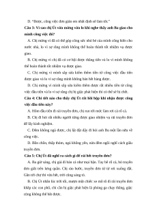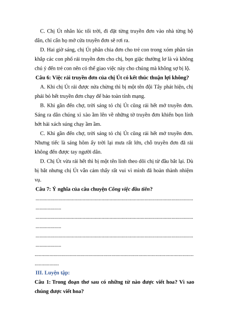 Câu 1: Công việc đầu tiên anh Ba giao cho chị Út là gì? A. Thăm dò cơ sở địch. B. Rải truyền đơn. C. Đi bán cá.