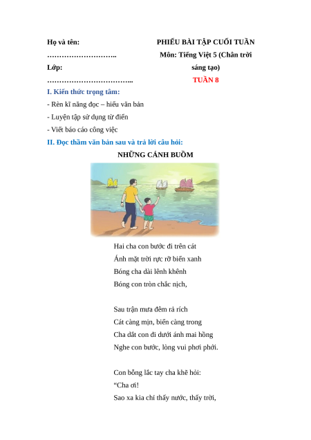 - Tailieugiaovien.com.vn giới thiệu phiếu bài tập cuối tuần môn Tiếng Việt lớp 5 bộ Chân trời sáng tạo mới nhất nhằm giúp Giáo viên có thêm tài liệu tham khảo Tiếng Việt lớp 5.
