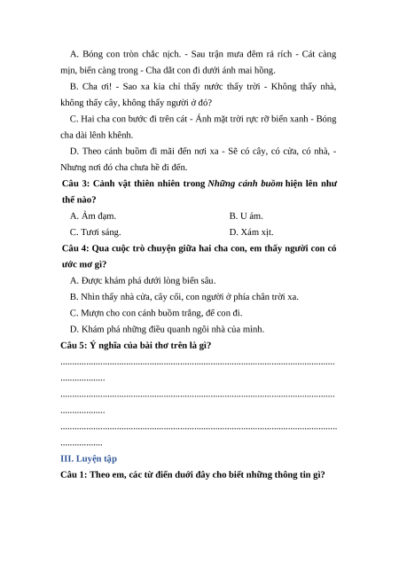Câu 3: Cảnh vật thiên nhiên trong Những cánh buồm hiện lên như thế nào? A. Ảm đạm. B. U ám. C. Tươi sáng. D. Xám xịt.