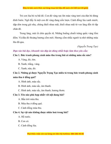Câu 1. Bức tranh phong cảnh mùa thu trong bài có những màu sắc nào? A. Vàng, đỏ, tím. B. Xanh, trắng, vàng. C. Xanh, nâu, đỏ.