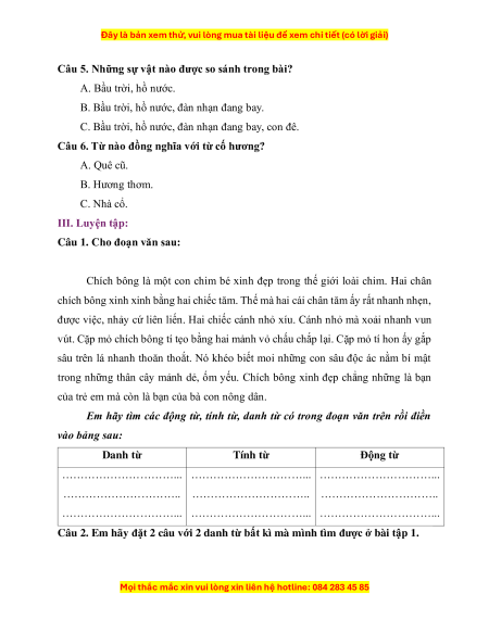 Câu 6. Từ nào đồng nghĩa với từ cố hương? A. Quê cũ. B. Hương thơm. C. Nhà cổ. III. Luyện tập: