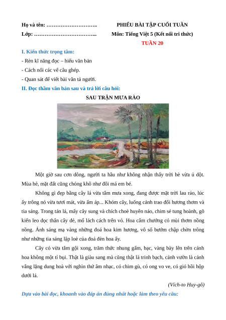 - Tailieugiaovien.com.vn giới thiệu phiếu bài tập cuối tuần Học kì 1 môn Tiếng Việt lớp 5 bộ Kết nối tri thức mới nhất nhằm giúp Giáo viên có thêm tài liệu tham khảo Tiếng Việt lớp 5.