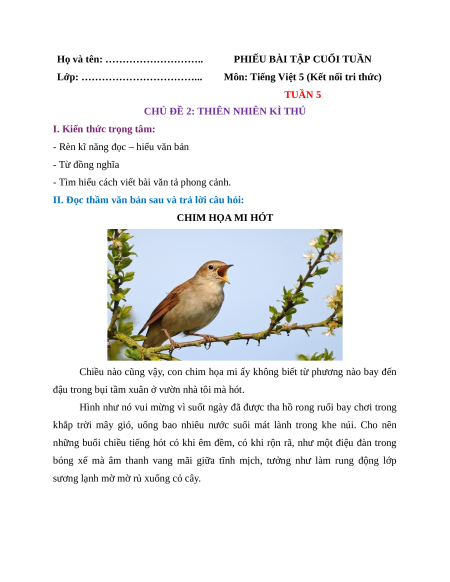 Bài tập cuối tuần Tiếng Việt lớp 5 Kết nối tri thức Tuần 5