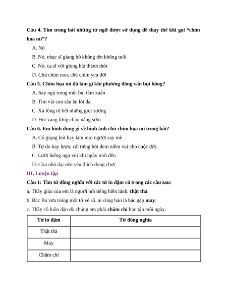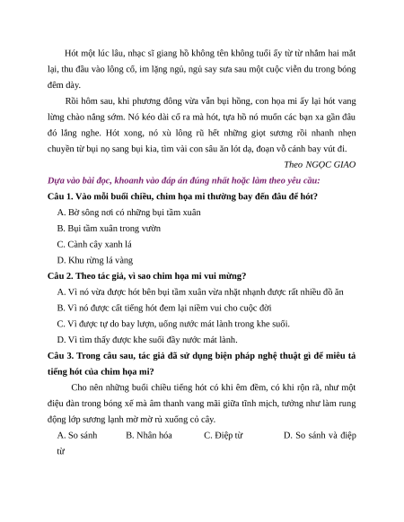 II. Đọc thầm văn bản sau và trả lời câu hỏi: CHIM HỌA MI HÓT