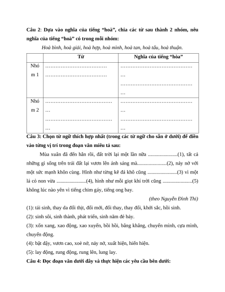 Câu 2: Dựa vào nghĩa của tiếng “hoà”, chia các từ sau thành 2 nhóm, nêu