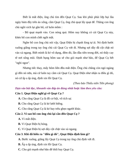 II. Đọc thầm văn bản sau và trả lời câu hỏi: HAI CÁI QUẠT