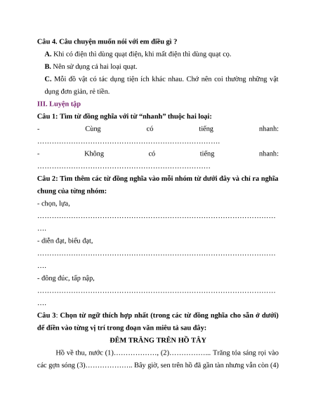 Câu 3: Chọn từ ngữ thích hợp nhất (trong các từ đồng nghĩa cho sẵn ở dưới)