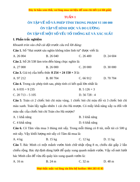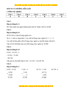 ơ sáu nghìn không trăm linh t ” ư đư c vi ợ t ế là: 26 004 Câu 2. Đáp án đúng là: D Số 26 538 có ch s ữ ố hàng nghìn là 6. Do 6 > 5 nên ta c ng t ộ hêm 1 vào ch s ữ ố hàng ch c nghì ụ n là: 2 + 1 = 3. Các ch s ữ ố bên ph i ả ch s ữ ố hàng ch c nghì ụ n ta chuy n ể thành ch s ữ 0. ố V y ậ số 26 538 đư c ợ làm tròn đ n hàng ch ế c ụ nghìn là: 30 000 Câu 3. Đáp án đúng là: B 8 254 + 24 150 × 3 = 8 254 + 72 450 = 80 704 V y ậ giá tr c ị a ủ bi u t ể h c 8 254 + 24 150 × 3 l ứ à: 80 704 Câu 4. Đáp án đúng là: C 6 035 + 9 235 5 126 × 3 20 713 – 5 105 56 728 : 4 6 035 5 126 20 713 9 235 3 5 105 15 270 15 378 15 608 M i