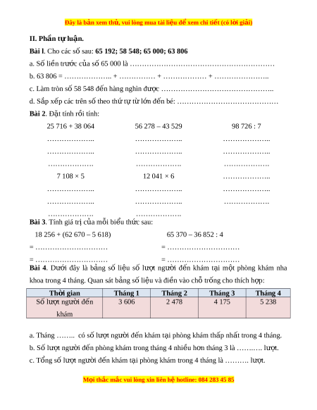 …………………………………… Bài 2. Đ t ặ tính r i ồ tính: 25 716 + 38 064 56 278 – 43 529 98 726 : 7 ……………….. ……………….. ……………….. ……………….. ……………….. ……………….. ………………. ………………. ………………. 7 108 × 5 12 041 × 6 ……………….. ……………….. ……………….. ……………….. ……………….. ……………….. ………………. ………………. ………………. Bài 3. Tính giá tr c ị a ủ m i ỗ bi u t ể h c s ứ au: 18 256 + (62 670 – 5 618) 65 370 – 36 852 : 4