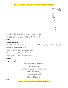 ẫ nhiên 1 cái cho Hà mư n. ợ Có m y ấ kh ả năng x y ả ra đ i ố v i ớ màu s c ắ c a chi ủ c bút ế chì Toàn cho Hà mư n? ợ A. 1 khả năng B. 3 kh năng ả C. 4 kh năng ả D. 6 khả năng Câu 6. Cô Tâm v a ừ mua 3 thùng mít s y ấ . Trong m i ỗ thùng có 8 túi, m i ỗ túi có 500 g mít s y ấ . V y kh ậ ối lư ng m ợ ít s y cô ấ Tâm đã mua là: A. 4 kg B. 15 kg C. 12 kg D. 11 kg