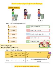 Bài 5: Chọn số thích hợp với mỗi tổng: 1 540 40 000 + 5 000 + 20 + 8 45 028 4 000 + 500 +10 + 9 70 504 90 000 + 2 000 + 400 + 80 + 1 4 519 1 000 + 500 + 40 92 481 70 000 + 500 + 4 PHẦN 2. TỰ LUẬN