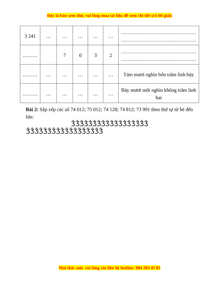 Bài 2: Sắp xếp các số 74 012; 75 012; 74 128; 74 812; 73 991 theo thứ tự từ bé đến lớn: