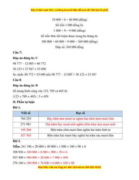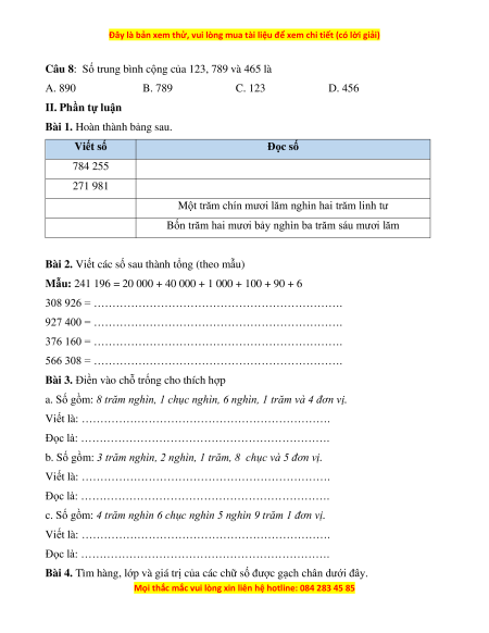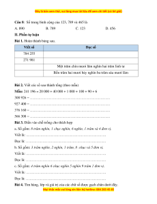 Câu 8: Số trung bình cộng của 123, 789 và 465 là A. 890 B. 789 C. 123 D. 456 II. Phần tự luận