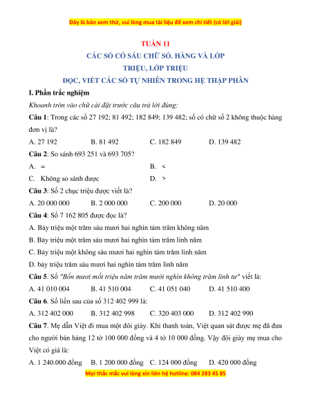 Câu 6. Số liền sau của số 312 402 999 là: A. 312 402 000 B. 312 402 998 C. 320 403 000 D. 312 402 990