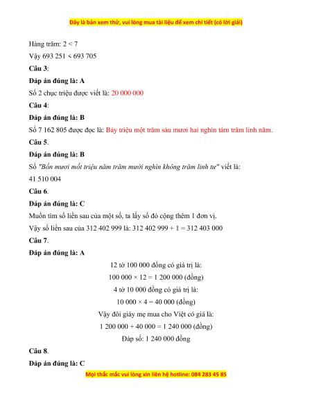 Câu 2: So sánh 693 251 và 693 705? A. = B. < C. Không so sánh được D. >