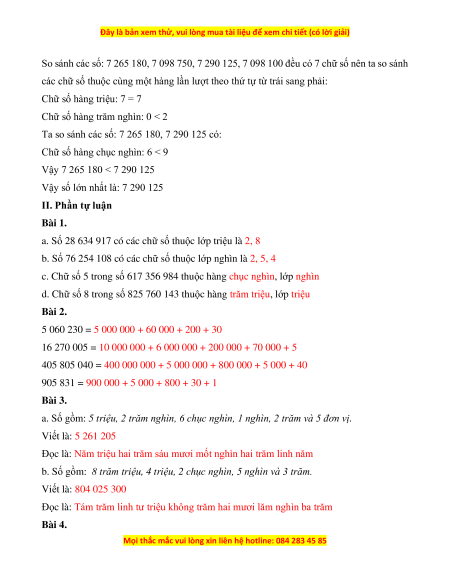 Câu 8. Số lớn nhất trong các số 7 265 180, 7 098 750, 7 290 125, 7098 100 là: A. 7 265 180 B. 7 098 750 C. 7290 125 D. 7 098 100 II. Phần tự luận