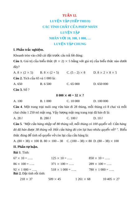 TUẦN 12. LUYỆN TẬP (TI P Ế THEO) CÁC TÍNH CH T Ấ C A Ủ PHÉP NHÂN LUYỆN TẬP NHÂN V I Ớ 10, 100, 1 000, … LUYỆN TẬP CHUNG I. Phần tr c nghi ắ m ệ .