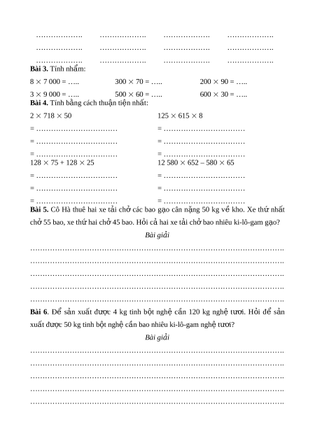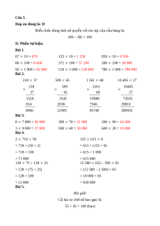 C. (100 – 38) 80 D. (80 – 38) 100 II. Phần t l ự u n. ậ Bài 1. Tính: 67 10 = ….. 125 10 = ….. 850 10 = ….. 86 100 = ….. 371 100 = ….. 289 100 = ….. 92 1 000 = ….. 518 1 000 = ….. 780 1 000 = ….. Bài 2. Đ t ặ tính r i ồ tính: 218 37 509 45 1 261 68 10 405 27 ………………. ………………. ………………. ………………. ………………. ………………. ………………. ………………. ………………. ………………. ………………. ………………. Bài 3. Tính nhẩm: 8 7 000 = ….. 300 70 = ….. 200 90 = ….. 3 9 000 = ….. 500 60 = ….. 600 30 = ….. Bài 4. Tính b ng ằ cách thu n ậ ti n nh ệ t ấ : 2 718 50 125 615 8