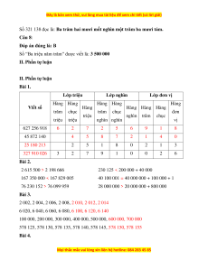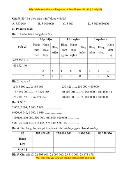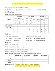 Câu 8: Số “Ba triệu năm trăm” được viết là? A. 350 000 B. 3 500 000 C. 3 500 D. 3 500 000 000 II. Phần tự luận