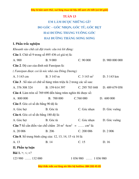 Câu 4. Làm tròn số 769 690 đến hàng trăm nghìn thì được số: A. 800 000 B. 700 000 C.760 000 D. 600 000