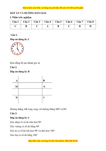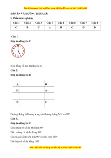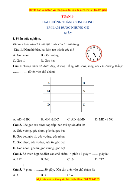 Câu 1. Đồng hồ bên, hai kim tạo thành góc gì? A. Góc nhọn B. Góc vuông C. Góc tù D. Góc bẹt