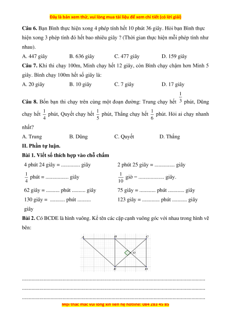 Câu 6. Bạn Bình thực hiện xong 4 phép tính hết 10 phút 36 giây. Hỏi bạn Bình thực