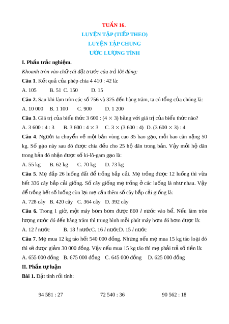 TUẦN 16. LUYỆN TẬP (TI P Ế THEO) LUYỆN TẬP CHUNG ƯỚC LƯỢNG TÍNH I. Phần tr c nghi ắ m ệ .