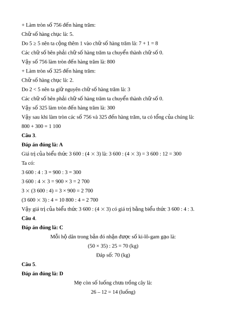 Câu 2. Sau khi làm tròn các s 756 và ố 325 đ n hàng t ế răm, ta có t ng c ổ a ủ chúng là: A. 10 000 B. 1 100 C. 900 D. 1 200 Câu 3. Giá tr c ị a bi ủ u t ể h c ứ 3 600 : (4 3) b ng ằ v i ớ giá tr c ị a ủ bi u t ể h c nào? ứ A. 3 600 : 4 : 3 B. 3 600 : 4 3
