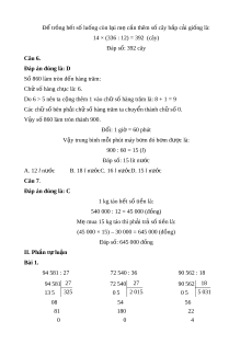 ề cho 25 hộ dân trong b n. ả V y ậ m i ỗ hộ dân trong b n đó nh ả n ậ đư c s ợ ố ki-lô-gam g o l ạ à: A. 55 kg B. 62 kg C. 70 kg D. 73 kg Câu 5. Mẹ đ p ắ 26 lu ng ố đ t ấ để tr ng ồ b p ắ c i ả . Mẹ tr ng ồ đư c ợ 12 lu ng ố thì v a ừ h t ế 336 cây b p ắ c i ả gi ng. ố Số cây gi ng ố mẹ tr ng ồ ở các lu ng ố là như nhau. V y ậ đ t ể rồng h t ế số lu ng còn ố l i ạ m c ẹ n t ầ hêm s cây b ố p ắ c i ả gi ng l ố à: