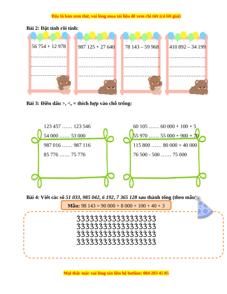 Bài 4: Viết các số 51 033, 985 042, 6 192, 7 365 128 sau thành tổng (theo mẫu):